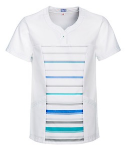 Vorderseite teilweise aus gestreiftem Gewebe, modischer Rundhalsausschnitt mit einem Knopf, 2 Seitentaschen, farbige Steppung, Seitenschlitze, 65% PES / 35% BW